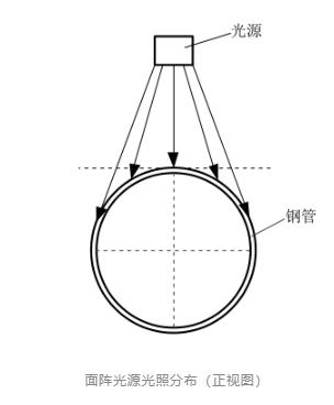 平面材料表面缺陷檢測的光照分布示意圖對于鋼管而言,因其幾何結(jié)構(gòu)特點(diǎn),當(dāng)采用面陣光源時,弧形外表面使得光源中心與被照射區(qū)域各處之間距離相差過大,如圖所示,與光源最短距離位置處表現(xiàn)為較高亮度,而在最短距離位置兩測,光照亮度分布減弱,圖像成像結(jié)果也表現(xiàn)類似特點(diǎn),中間區(qū)域像素灰度分布較高而兩側(cè)區(qū)域像素灰度值較小。